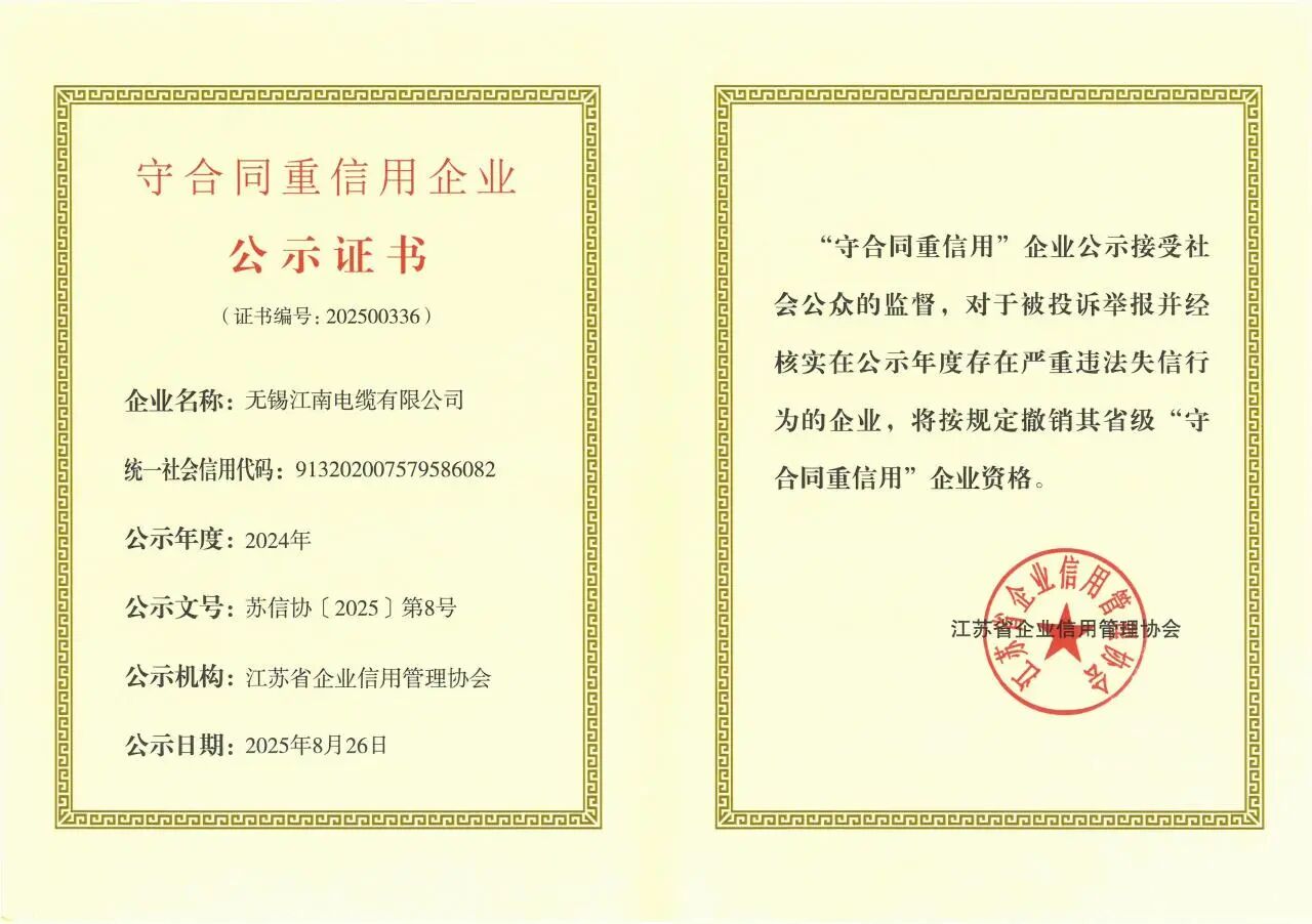 近日,江苏省企业信用管理协会发布2024年度省级“守合同重信用”公示企业名单,江南电缆再次获评“省级守合同重信用”企业。