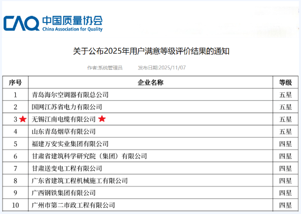 江南电缆凭借在电缆领域多年深耕积累的过硬技术实力与稳定产品品质,与青岛海尔、国网江苏电力等公司,共6家企业成功获评“用户满意五星级” 称号。