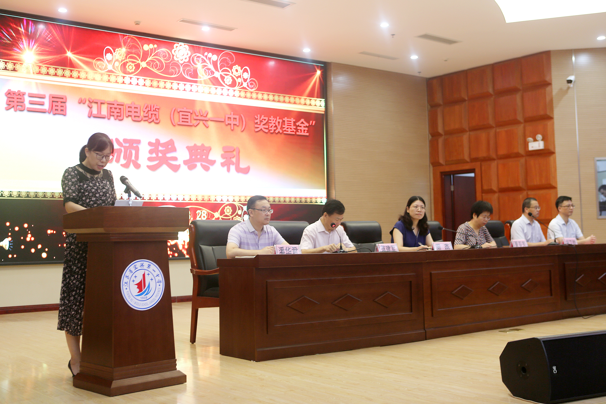 8月28日,第三届“江南电缆(宜兴一中)奖教基金”颁奖典礼在宜兴一中举行。市一中校长周燕、副校长潘华君、蒋建军、王永辉、施卫群等校领导及全体教职工共同见证了这一荣耀时刻。江南电缆常务副总经理夏亚芳受邀担任颁奖嘉宾。