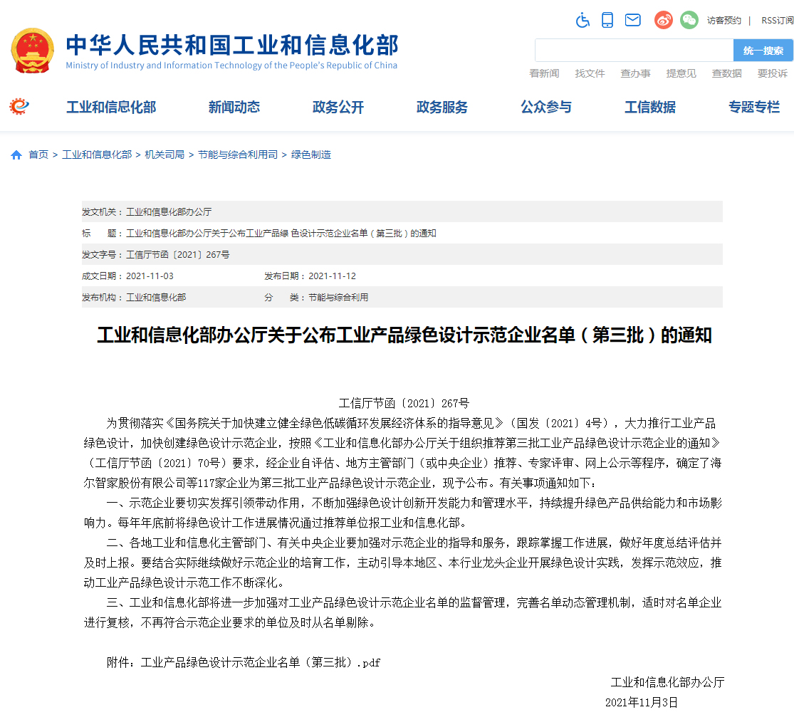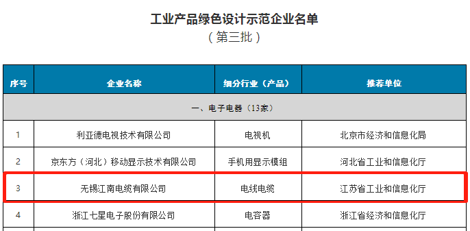 近日,工业和信息化部公布第三批工业产品绿色设计示范企业名单,江南电缆榜上有名,荣获“工业产品绿色设计示范企业”称号。工业和信息化部要求,示范企业要切实发挥引领带动作用,不断加强绿色设计创新开发能力和管理水平,持续提升绿色产品供给能力和市场影响力。